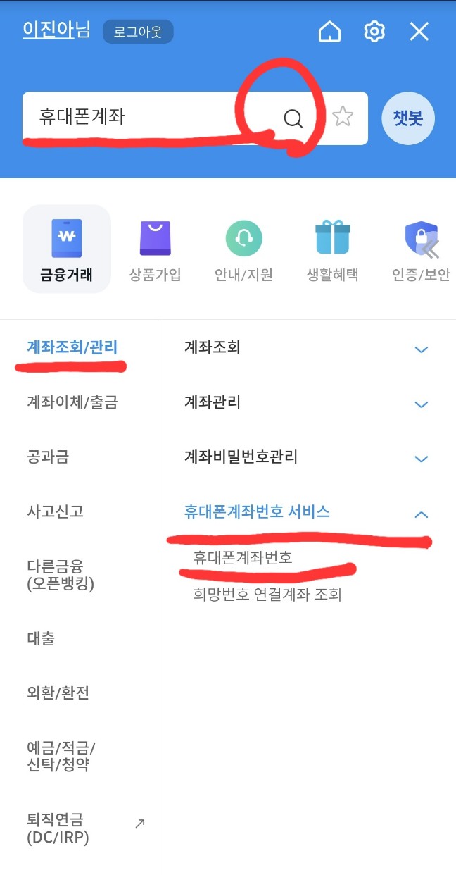 왼쪽 계좌번호조회/관리 메뉴로 들어가서