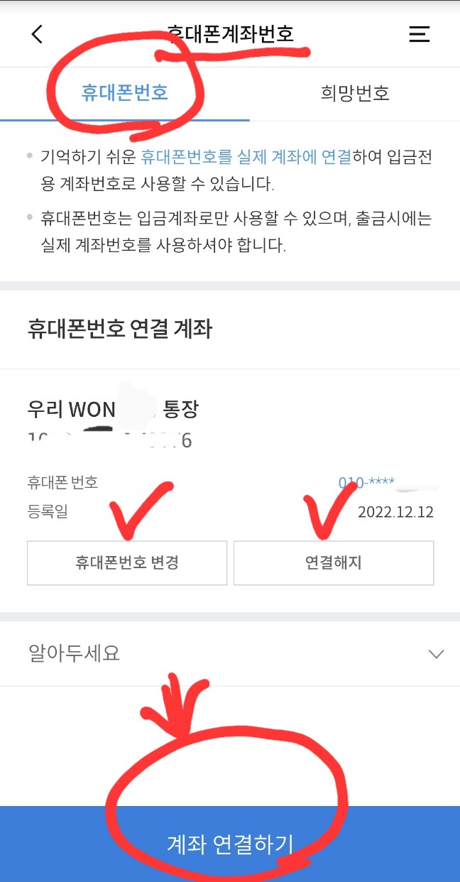 계좌에 연결된 휴대폰번호를 변경하고 싶으시다면