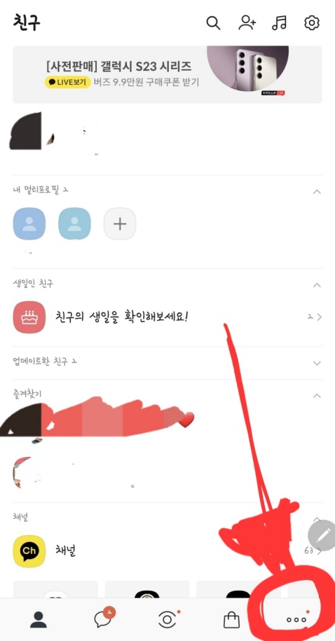 카카오톡 앱 아래 제일 오른쪽 점이 세개있는 전체 버튼을 터치하면 카카오톡