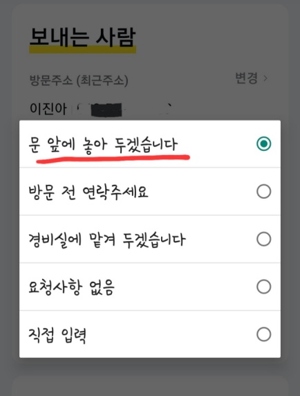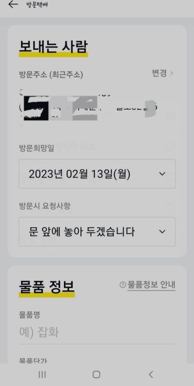 먼저 보내는 사람, 즉 나의 이름, 연락처, 주소를 정확하게 입력하고 방문을 희망하는 날짜, 방문시 요청사항을 선택합니다. 저 같은 경우는 문앞에 물건을 두고 가는 경우가 많아서 방문시 요청사항에 항상 문앞에 놓아 두겠습니다.를 신청합니다.