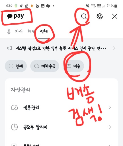 카카오페이 페이지에 전체를 터치 후 -> 돋보기에 배송을 검색해 줍니다.