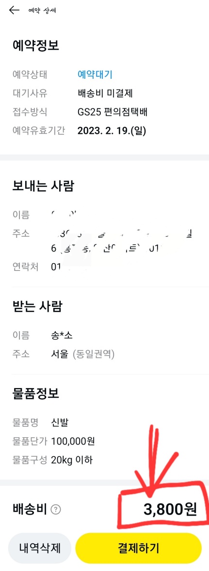 상대방이 주소 입력 또는 요청받은 주소입력과 택배비 결제까지 끝나면